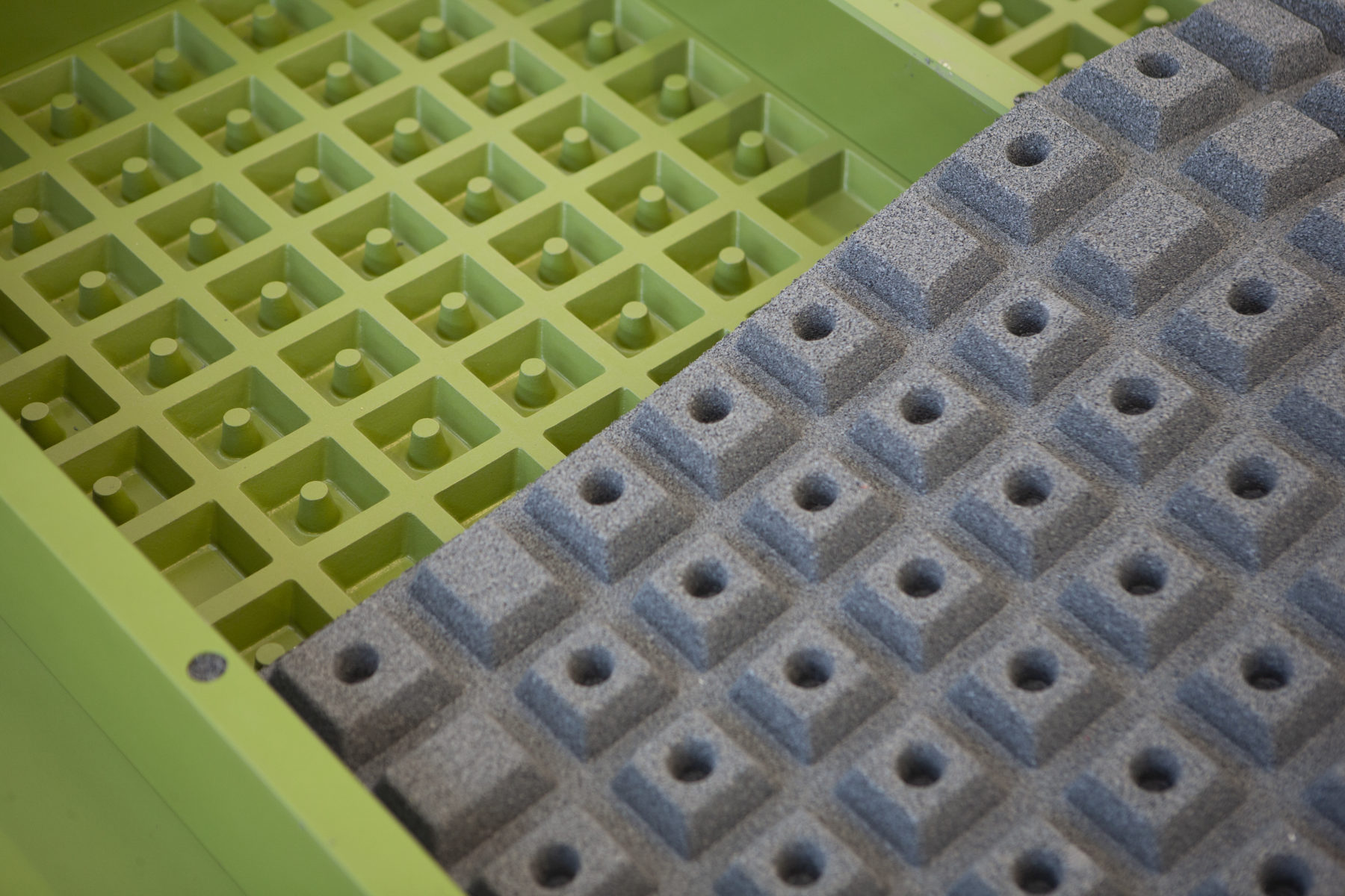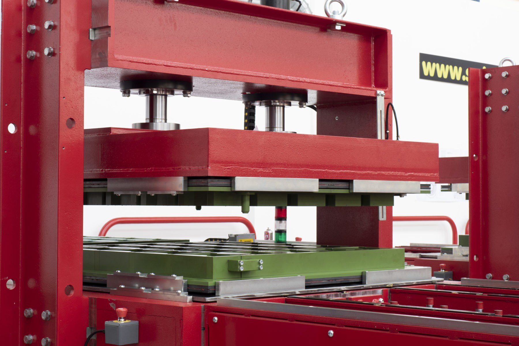 Pressa automatica a doppio stampo per la produzione di manufatti in gomma riciclata. Tramite il software dedicato è possibile intervenire su tutti i parametri di produzione ed impostare un ciclo automatico di produzione continua. La macchina è dotata di due piastre scorrevoli di base, di un punzione di pressatura ed è compatibile con tutta la gamma di stampi Salvadori.