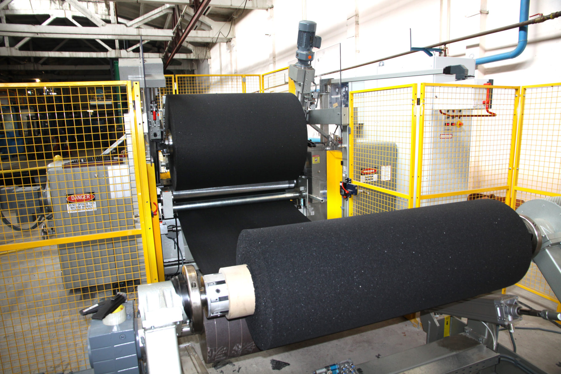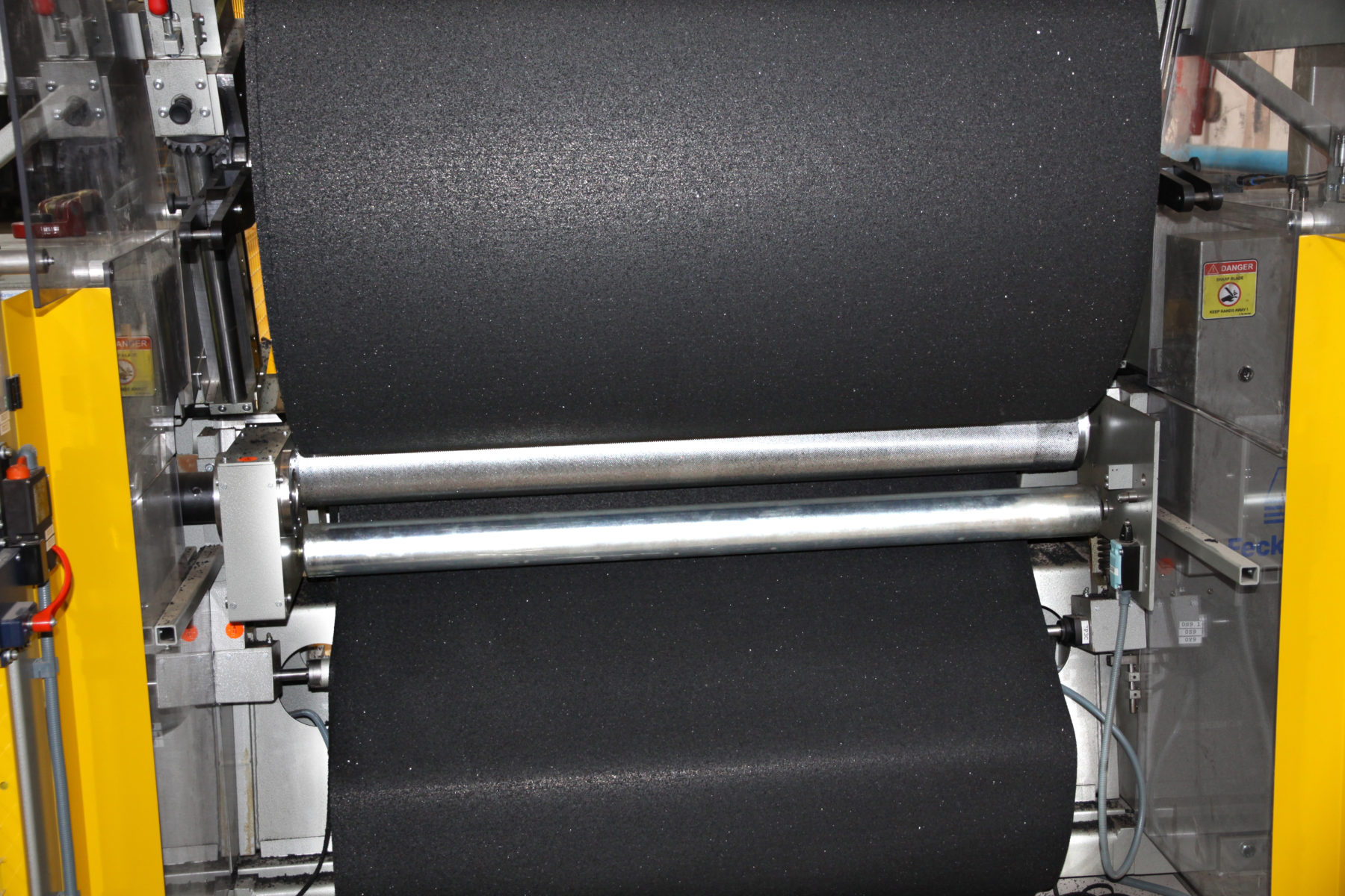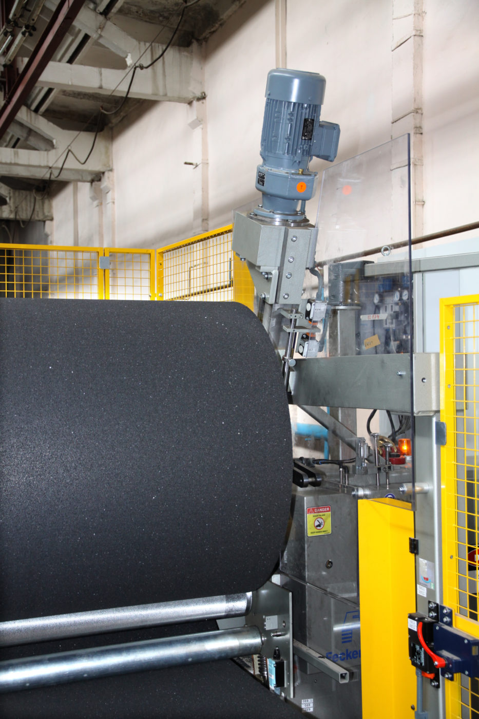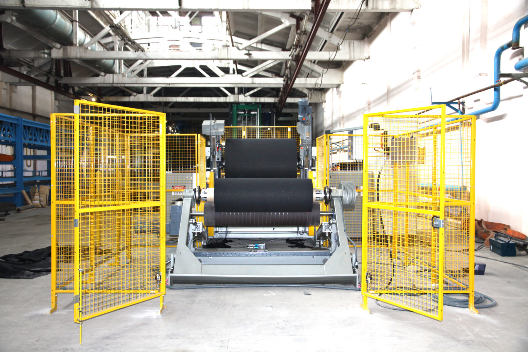 Macchina sezionatrice per tagliare i cilindri di gomma risultanti dal macchinario Titan. La sezionatrice taglia il cilindro in fogli di spessore minimo 3mm e massimo 10mm.