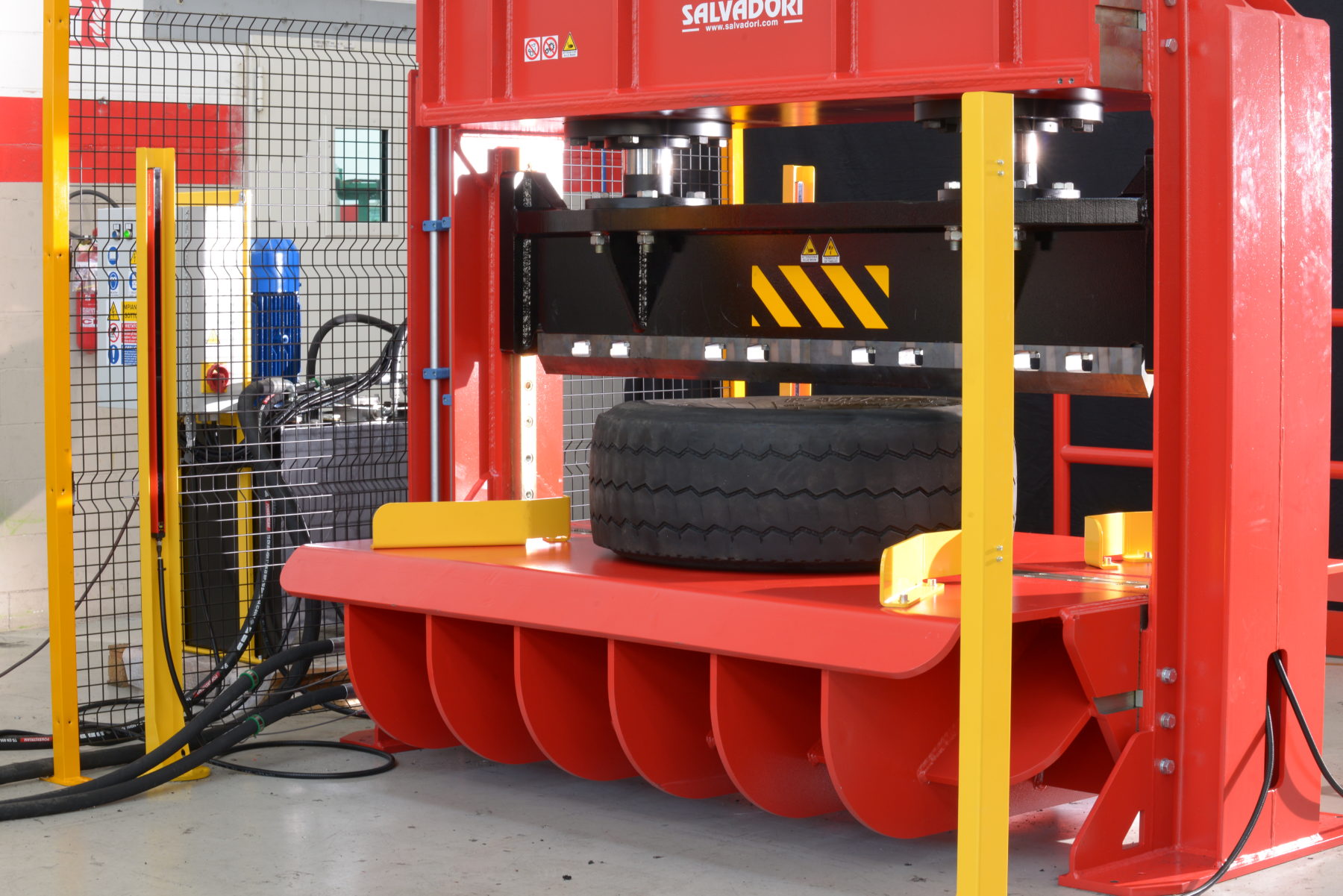 Cesoia idraulica per la riduzione volumetrica degli pneumatici camion fino a 24.5" La riduzione volumetrica rende piu' economico il trasporto ed agevola le successive fasi di lavorazione degli impianti di riciclaggio.