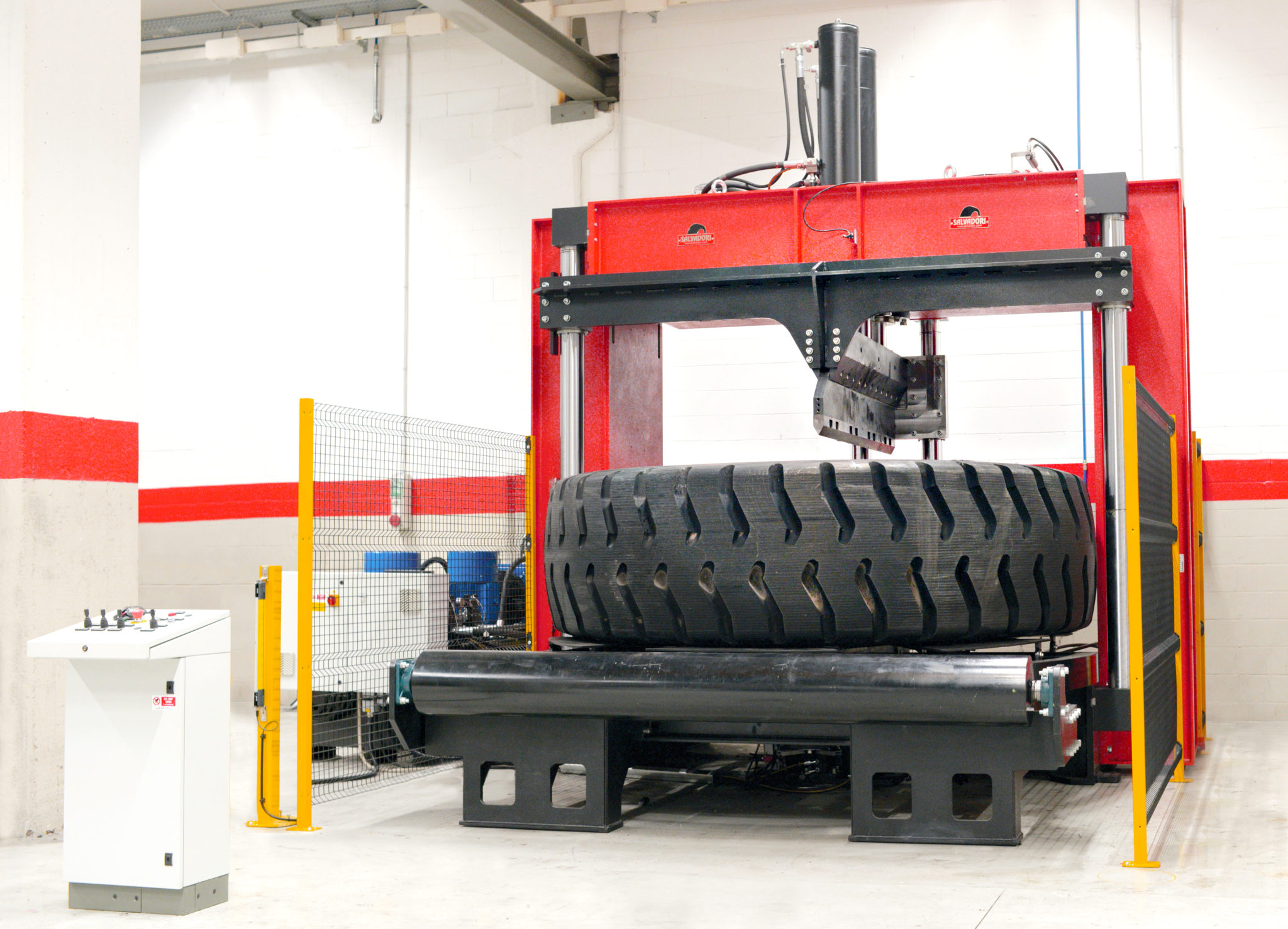Hydraulic shear for the volume reduction of tires. The volumetric reduction makes transport more economical and facilitates the subsequent processing phases of recycling plants.